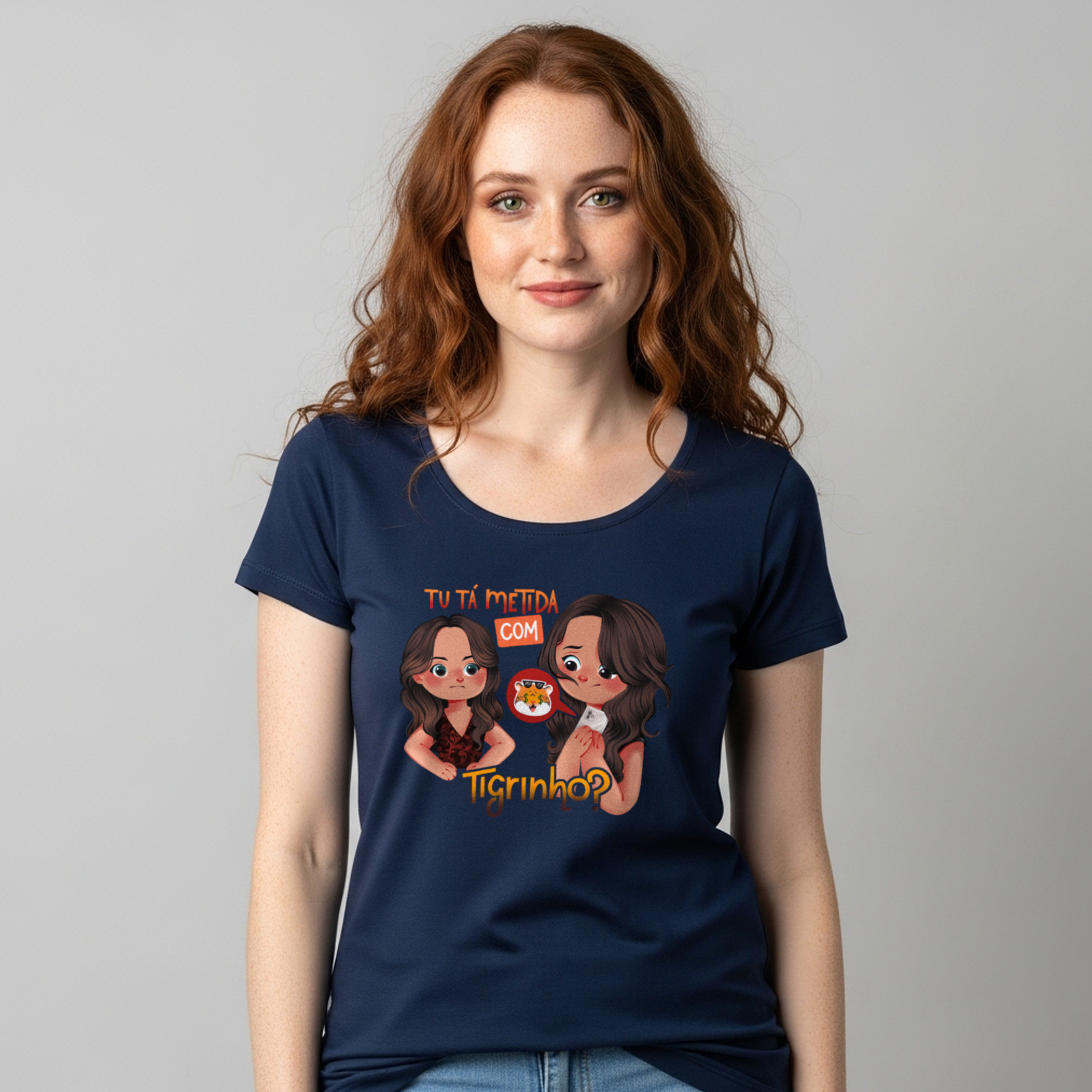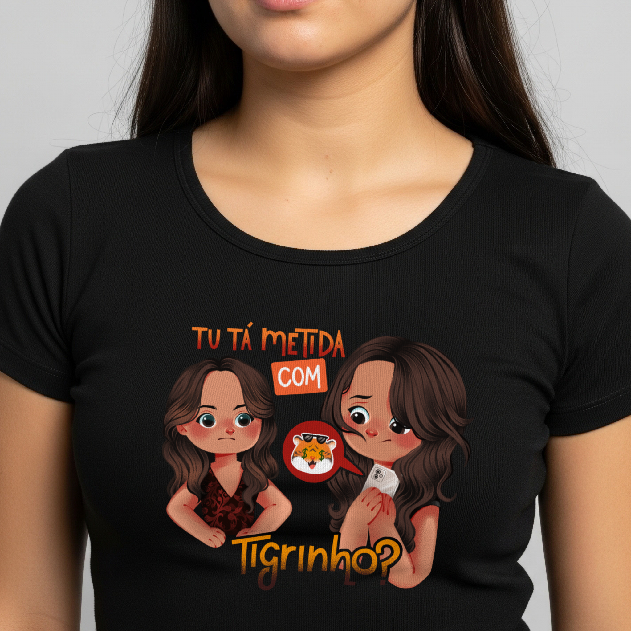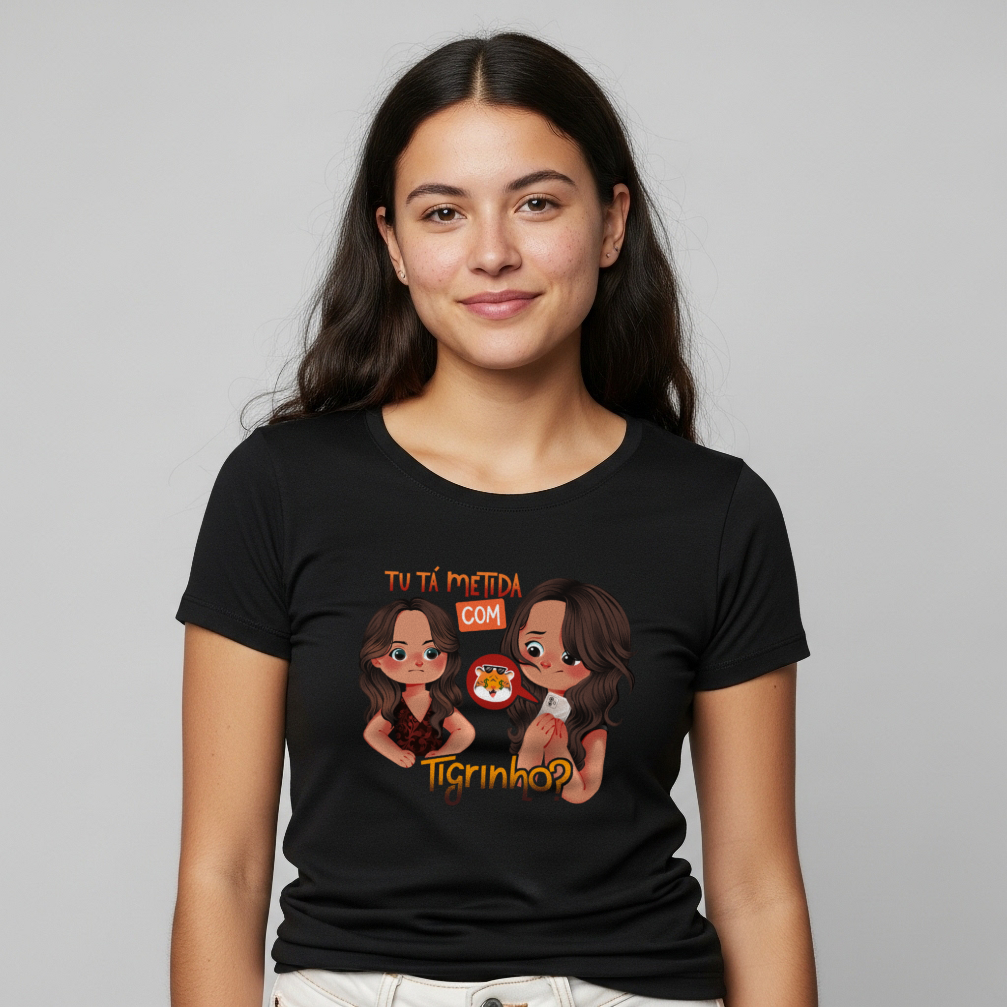 A camiseta Tu Tá Metida com Tigrinho? traz uma releitura bem-humorada de uma das cenas mais marcantes de Salve Jorge. Lucimar surge com aquele olhar que dispensa palavras, enquanto Morena esconde o celular, sem saber onde enfiar a cara. A frase icônica agora ganha um novo contexto, refletindo um hábito moderno que muita gente evita comentar. Um toque de crítica disfarçada de meme, perfeito pra quem ama novela, memes e verdades ditas com sutileza.