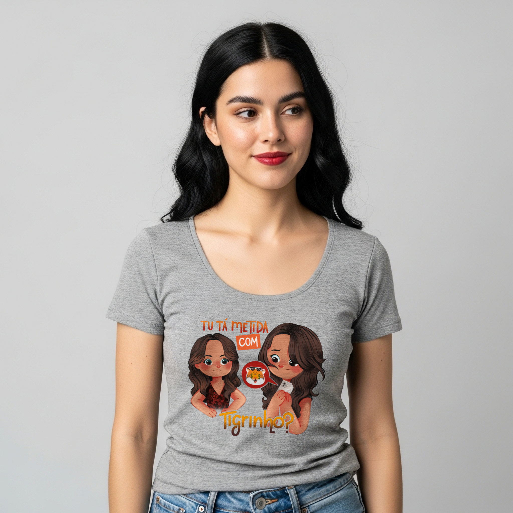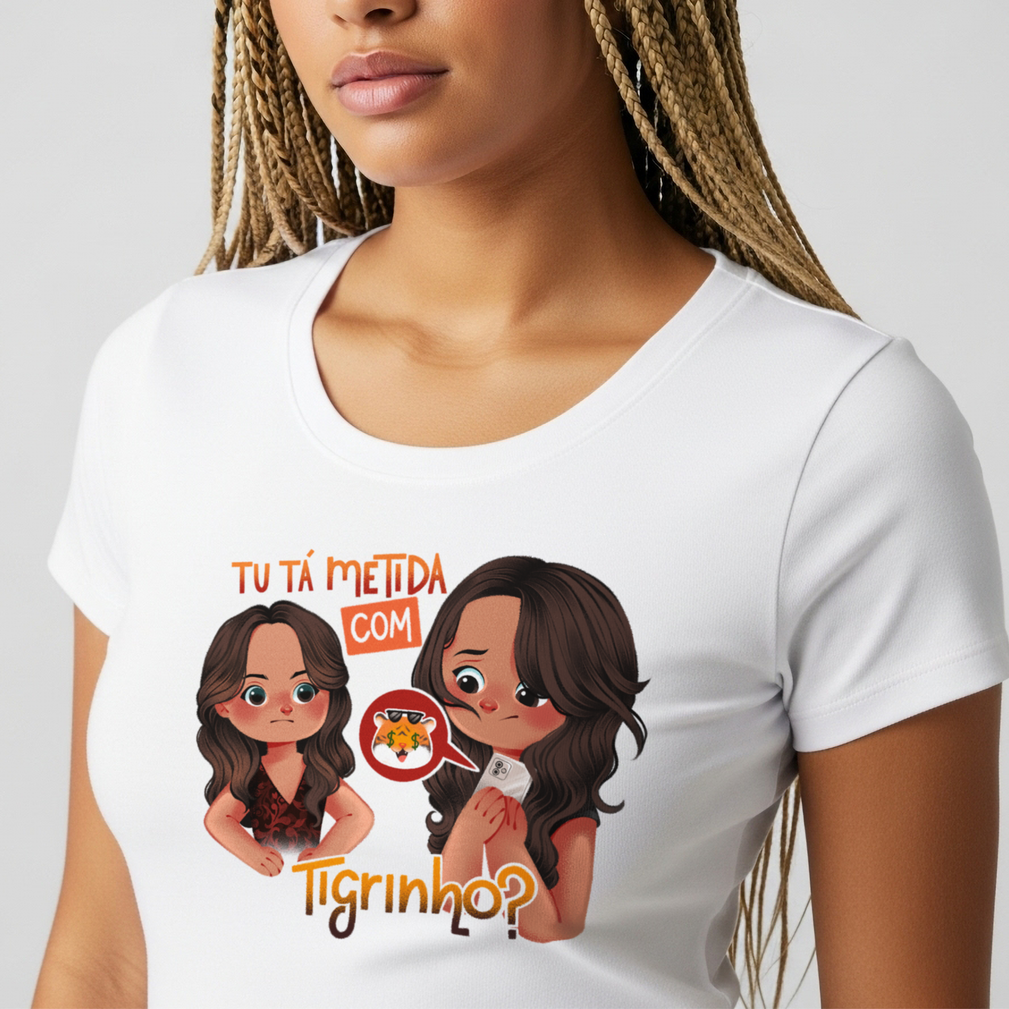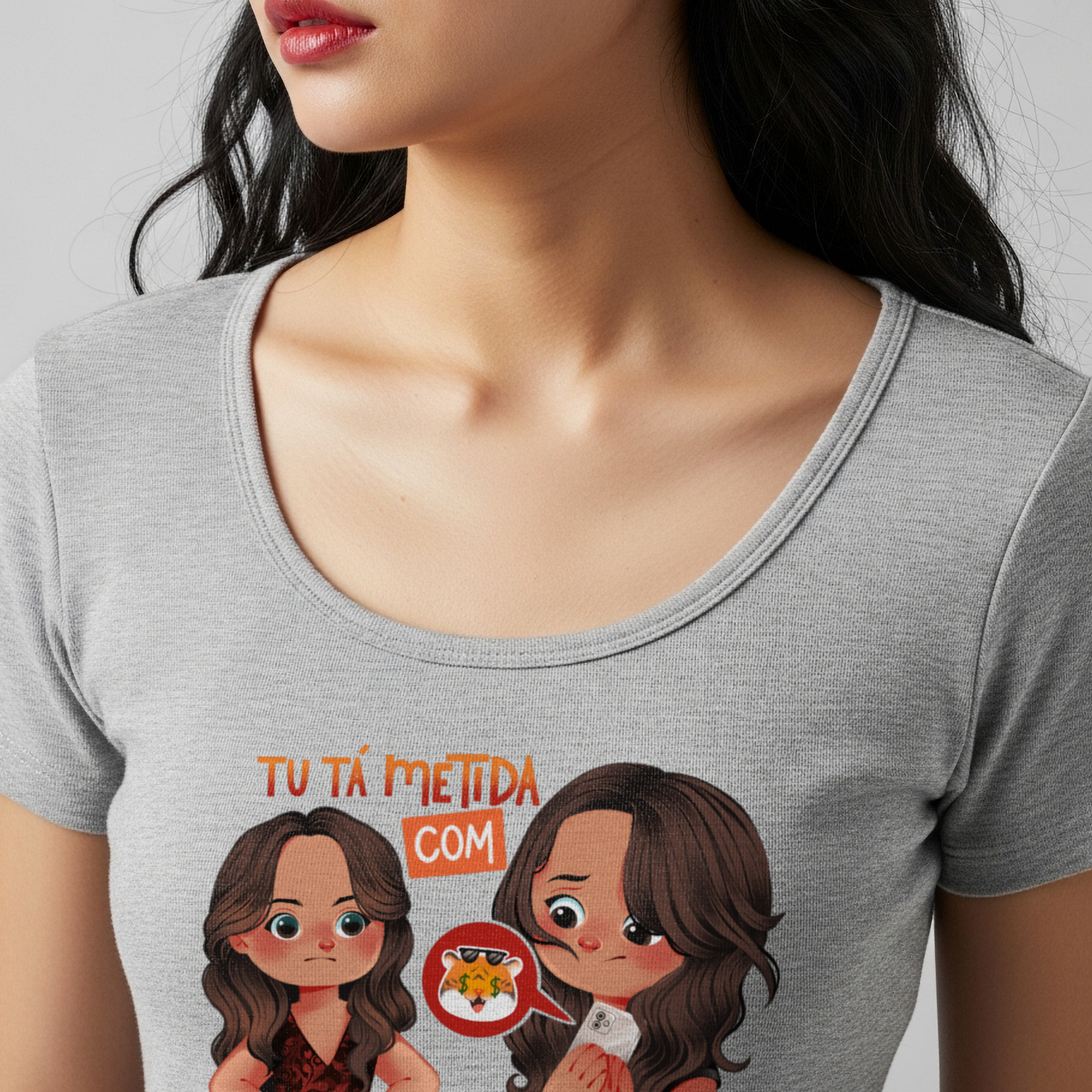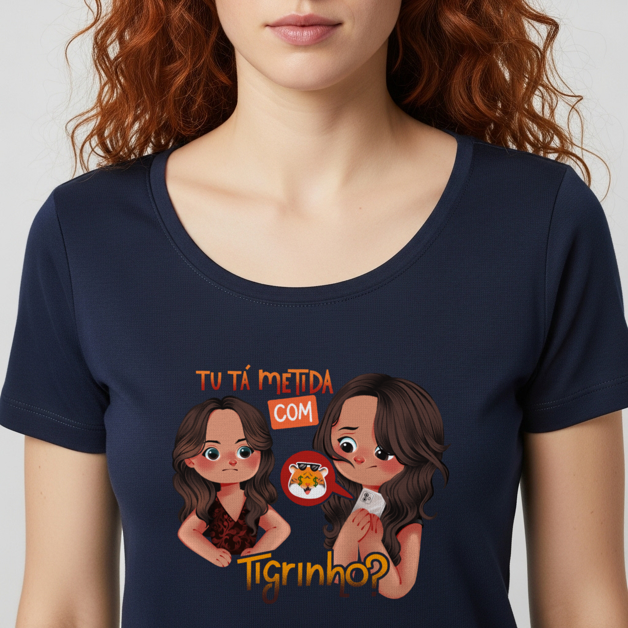 A camiseta Tu Tá Metida com Tigrinho? traz uma releitura bem-humorada de uma das cenas mais marcantes de Salve Jorge. Lucimar surge com aquele olhar que dispensa palavras, enquanto Morena esconde o celular, sem saber onde enfiar a cara. A frase icônica agora ganha um novo contexto, refletindo um hábito moderno que muita gente evita comentar. Um toque de crítica disfarçada de meme, perfeito pra quem ama novela, memes e verdades ditas com sutileza.