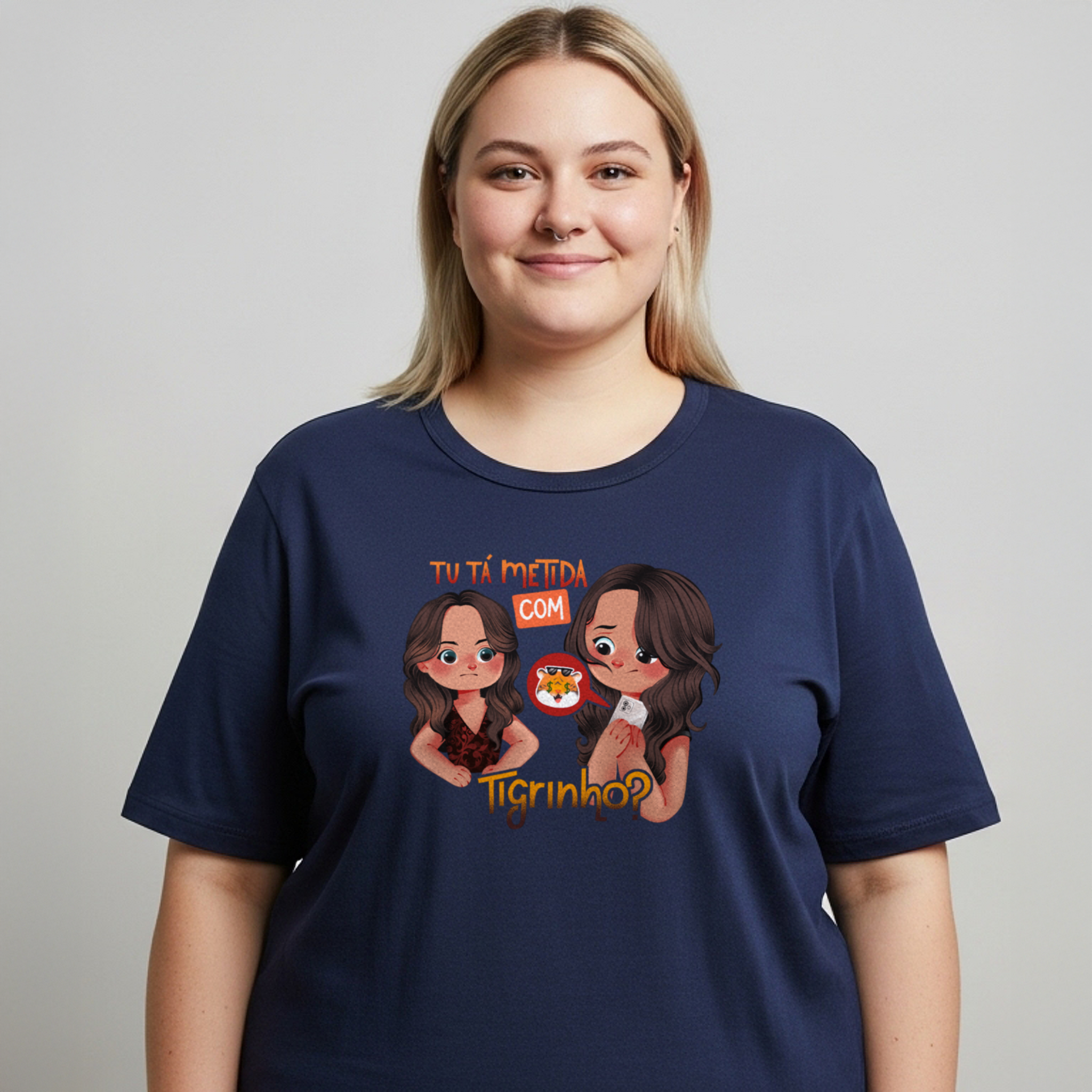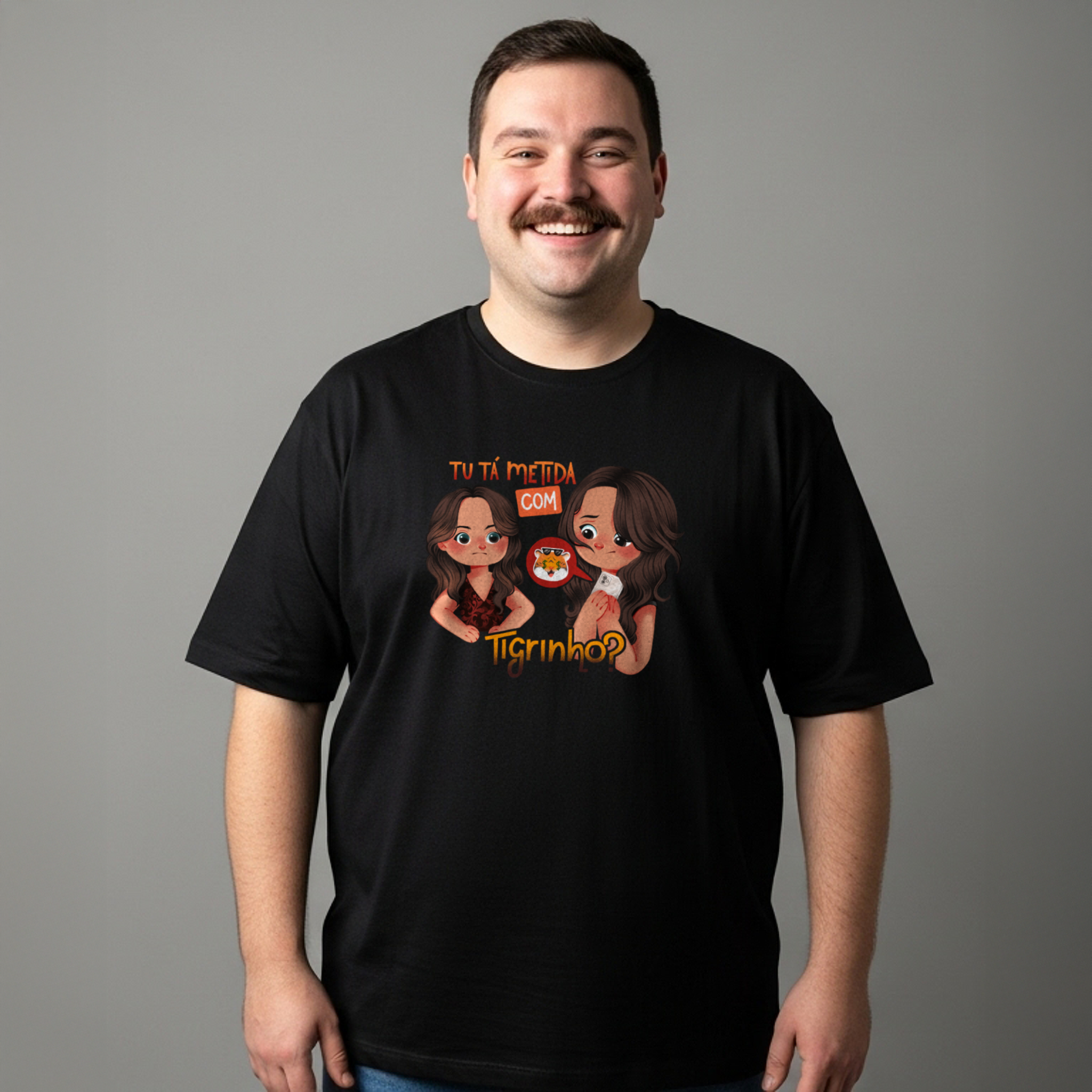 A camiseta Tu Tá Metida com Tigrinho? traz uma releitura bem-humorada de uma das cenas mais marcantes de Salve Jorge. Lucimar surge com aquele olhar que dispensa palavras, enquanto Morena esconde o celular, sem saber onde enfiar a cara. A frase icônica agora ganha um novo contexto, refletindo um hábito moderno que muita gente evita comentar. Um toque de crítica disfarçada de meme, perfeito pra quem ama novela, memes e verdades ditas com sutileza.