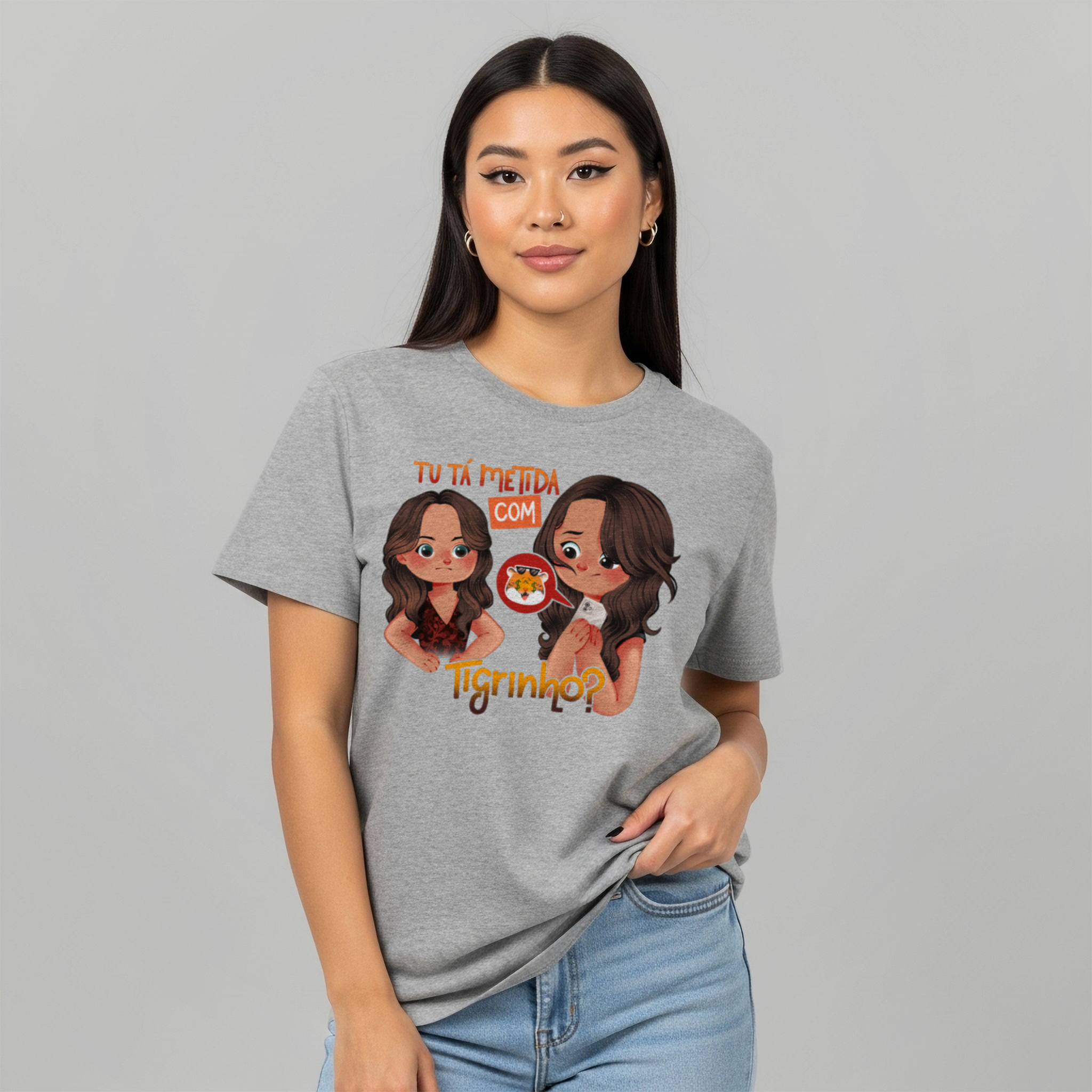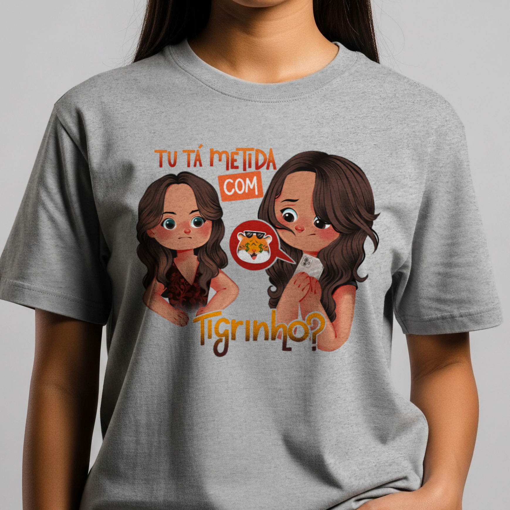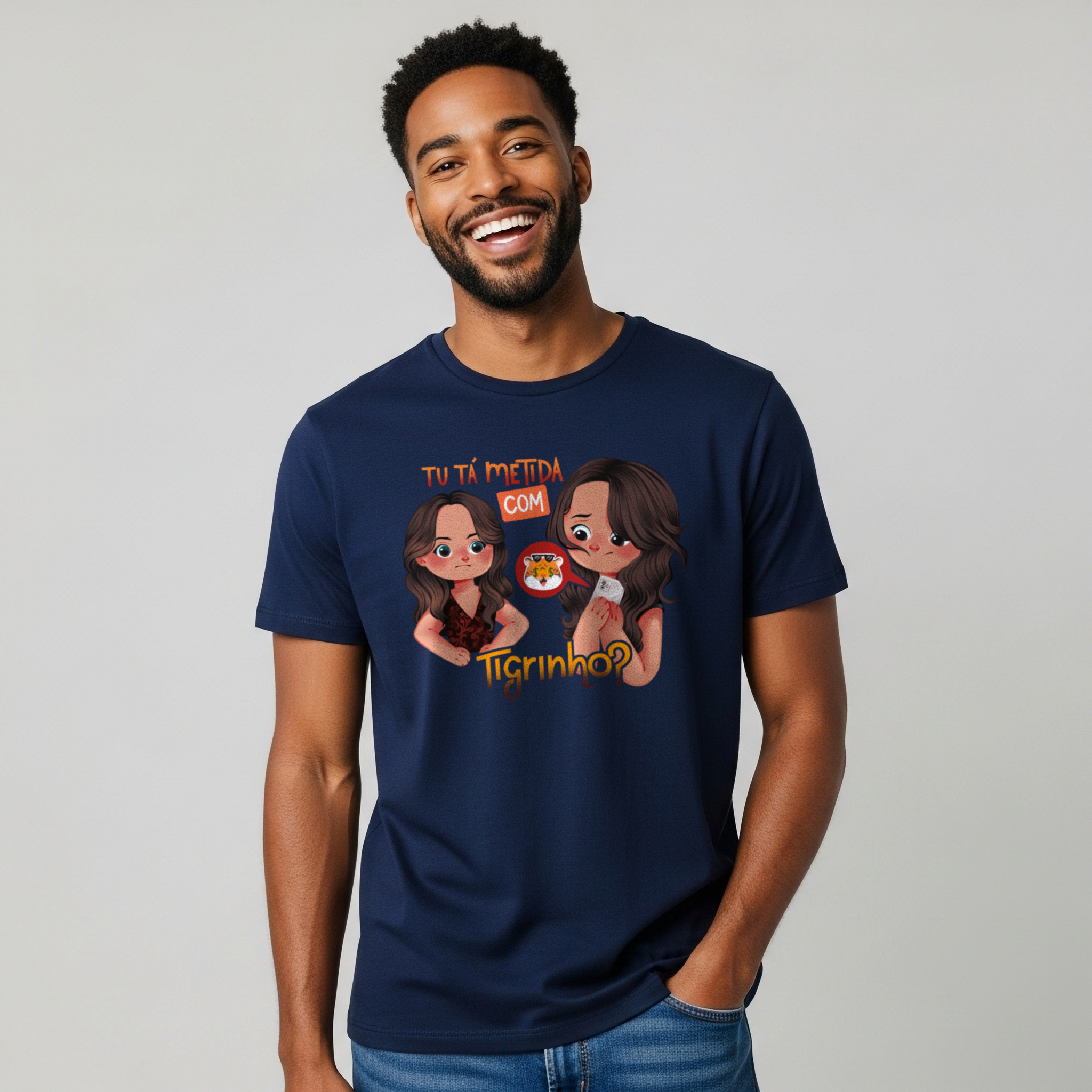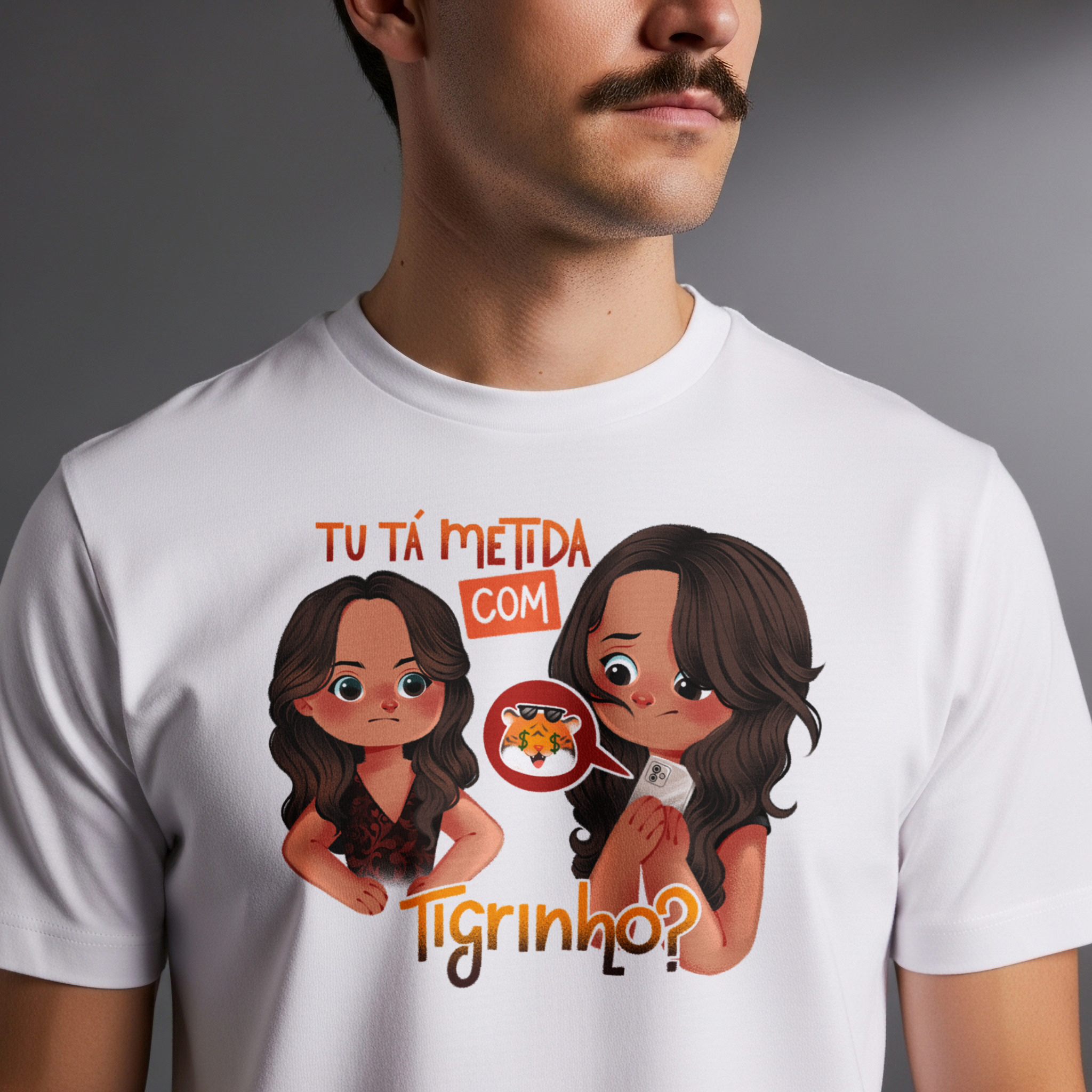 A camiseta Tu Tá Metida com Tigrinho? traz uma releitura bem-humorada de uma das cenas mais marcantes de Salve Jorge. Lucimar surge com aquele olhar que dispensa palavras, enquanto Morena esconde o celular, sem saber onde enfiar a cara. A frase icônica agora ganha um novo contexto, refletindo um hábito moderno que muita gente evita comentar. Um toque de crítica disfarçada de meme, perfeito pra quem ama novela, memes e verdades ditas com sutileza.