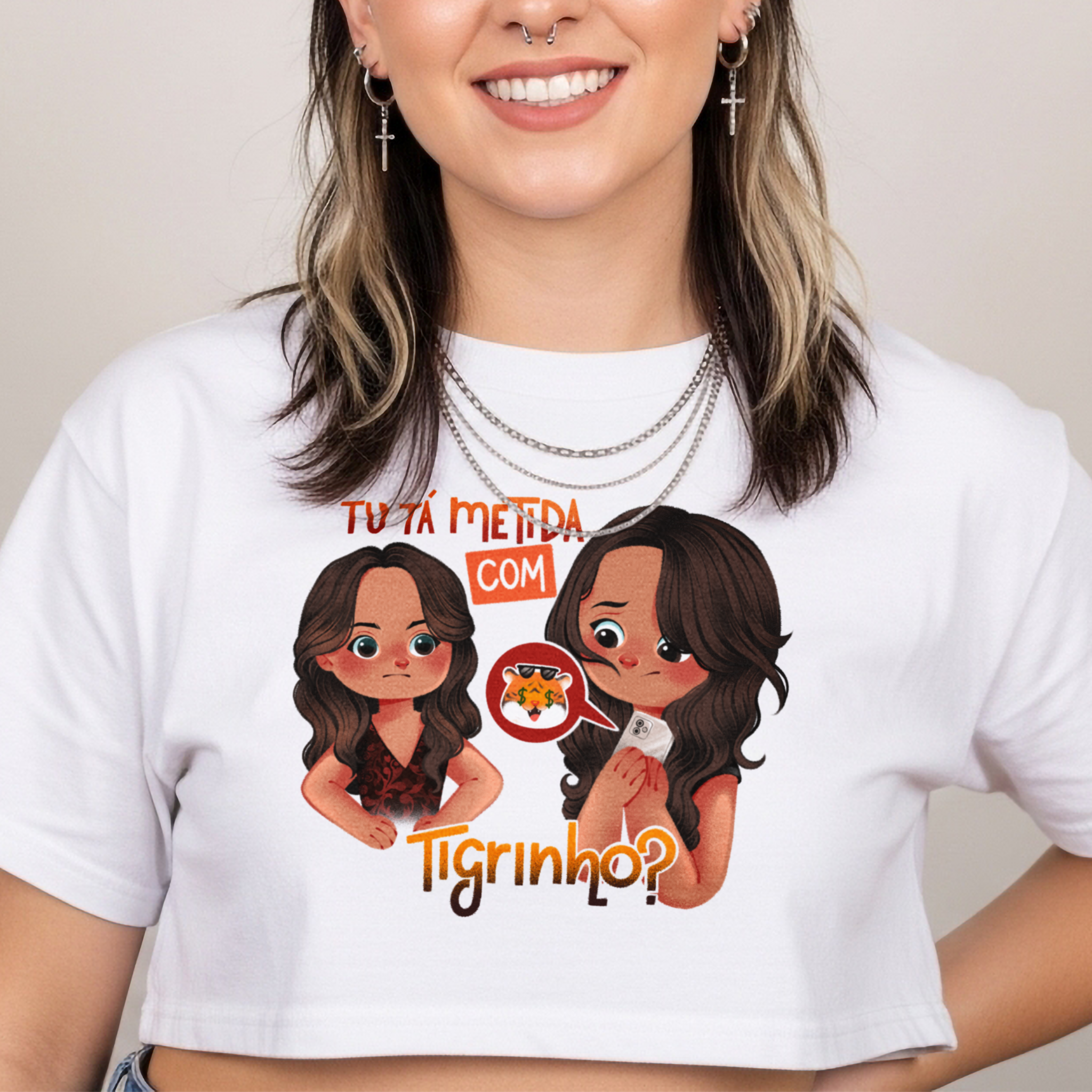 A camiseta Tu Tá Metida com Tigrinho? traz uma releitura bem-humorada de uma das cenas mais marcantes de Salve Jorge. Lucimar surge com aquele olhar que dispensa palavras, enquanto Morena esconde o celular, sem saber onde enfiar a cara. A frase icônica agora ganha um novo contexto, refletindo um hábito moderno que muita gente evita comentar. Um toque de crítica disfarçada de meme, perfeito pra quem ama novela, memes e verdades ditas com sutileza.
