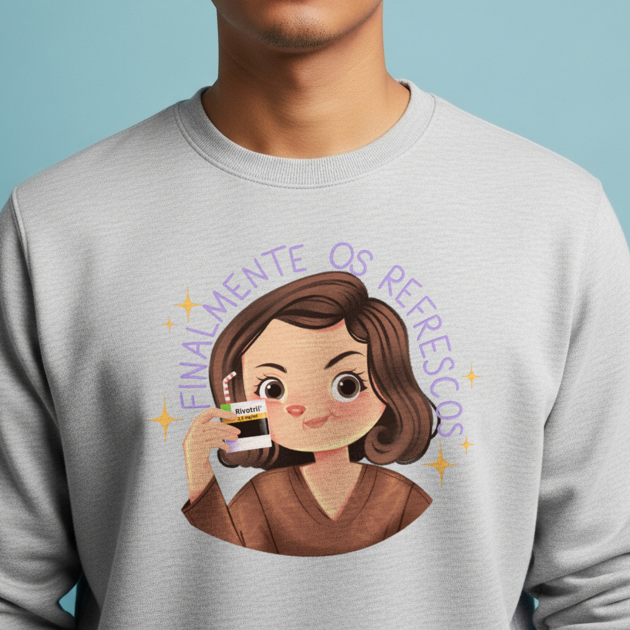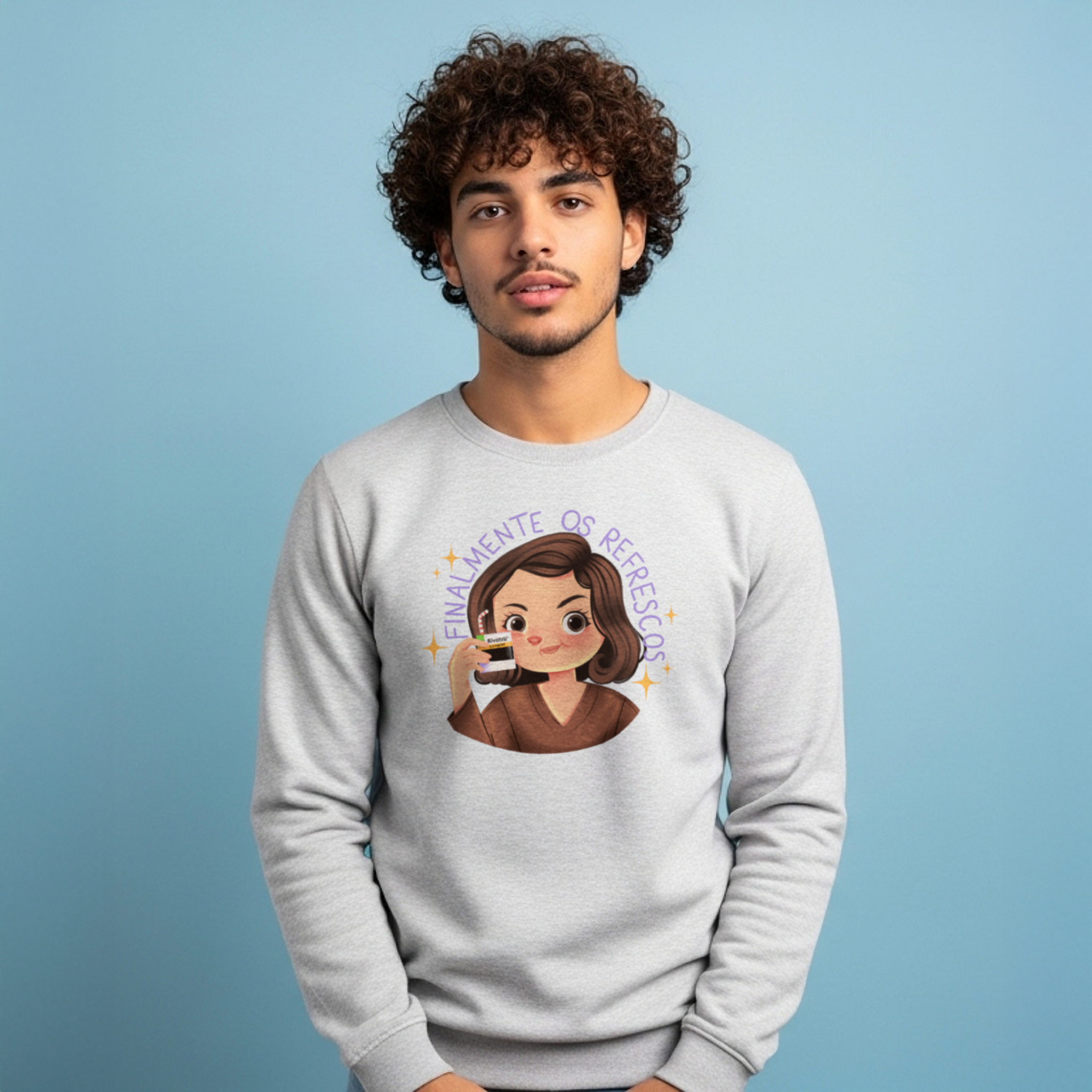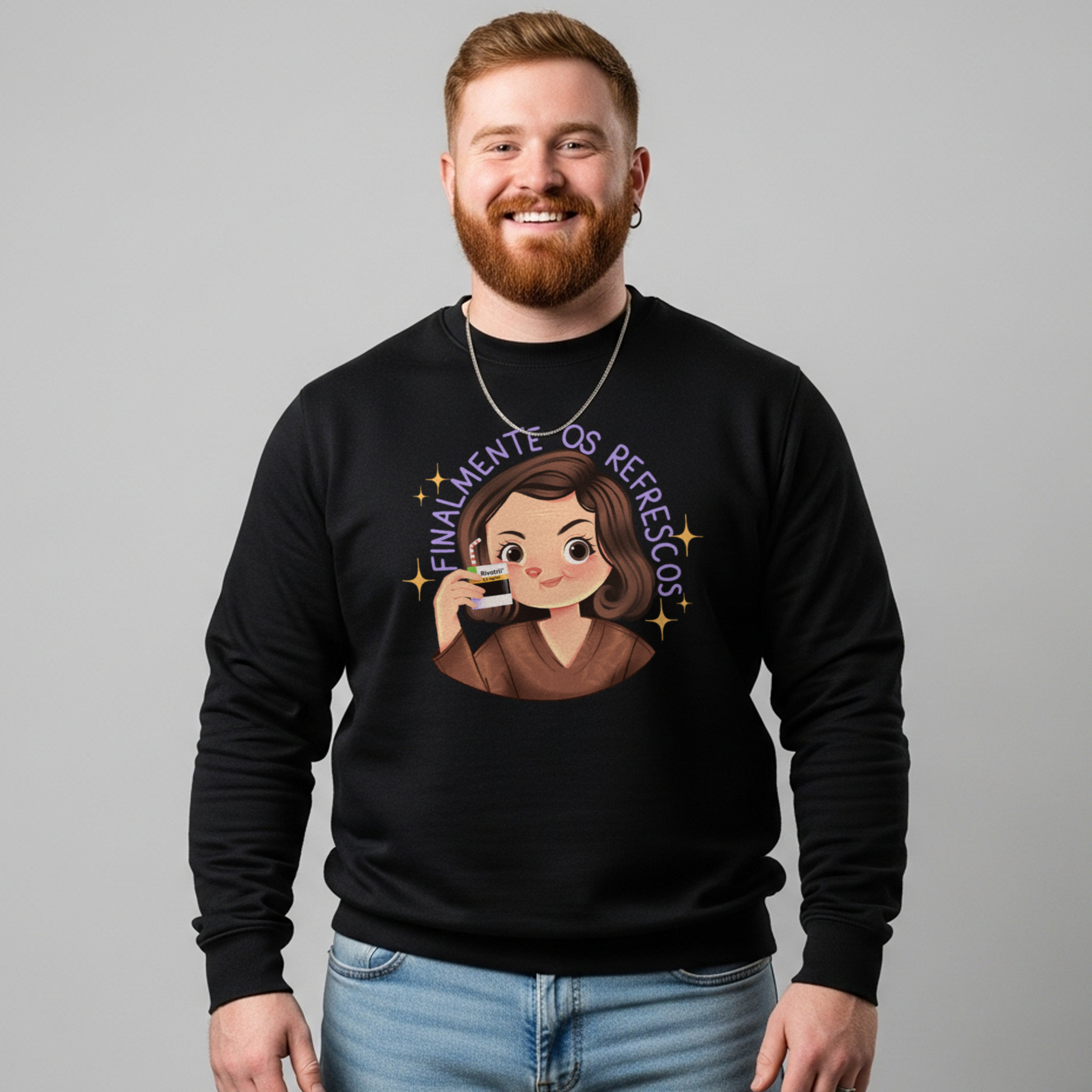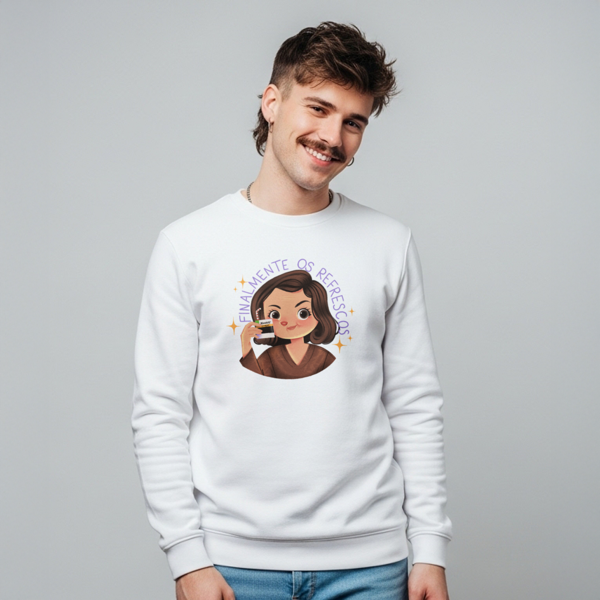 Se a vida adulta fosse fácil, não precisaríamos de refrescos. O moletom Finalmente os Refrescos… da Vida Adulta brinca com o icônico meme de Alma Gêmea, onde Débora (Ana Lúcia Torre) celebra o momento com um suquinho salvador. Só que nesta versão, o refresco vem em dose tarja preta — bem ao gosto de quem enfrenta boletos, prazos e reuniões que poderiam ter sido um e-mail. Ideal para fãs de novelas, cultura pop e humor ácido, esta peça é um lembrete estiloso: viva com drama, mas nunca sem seus "refrescos".