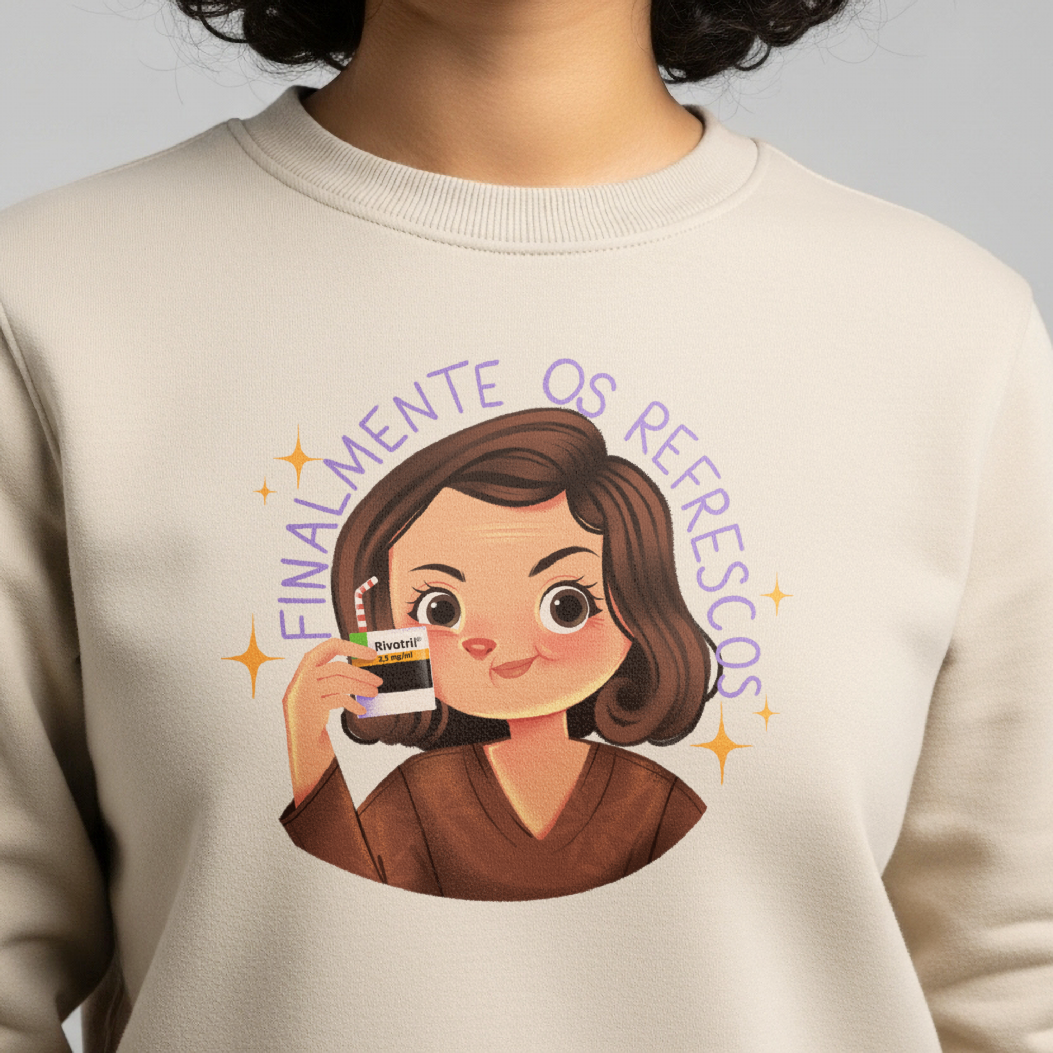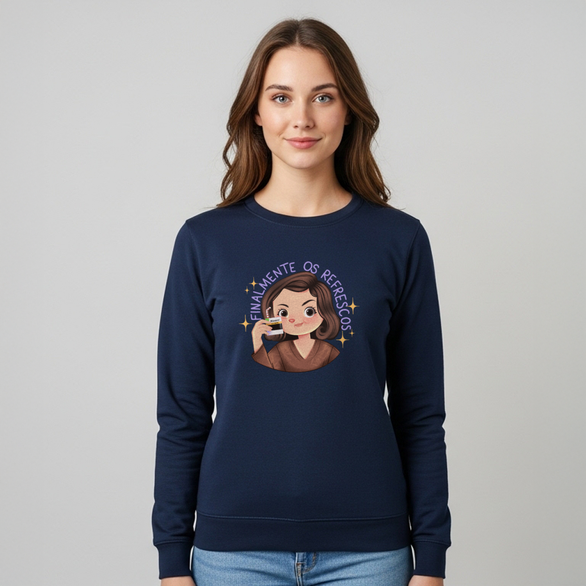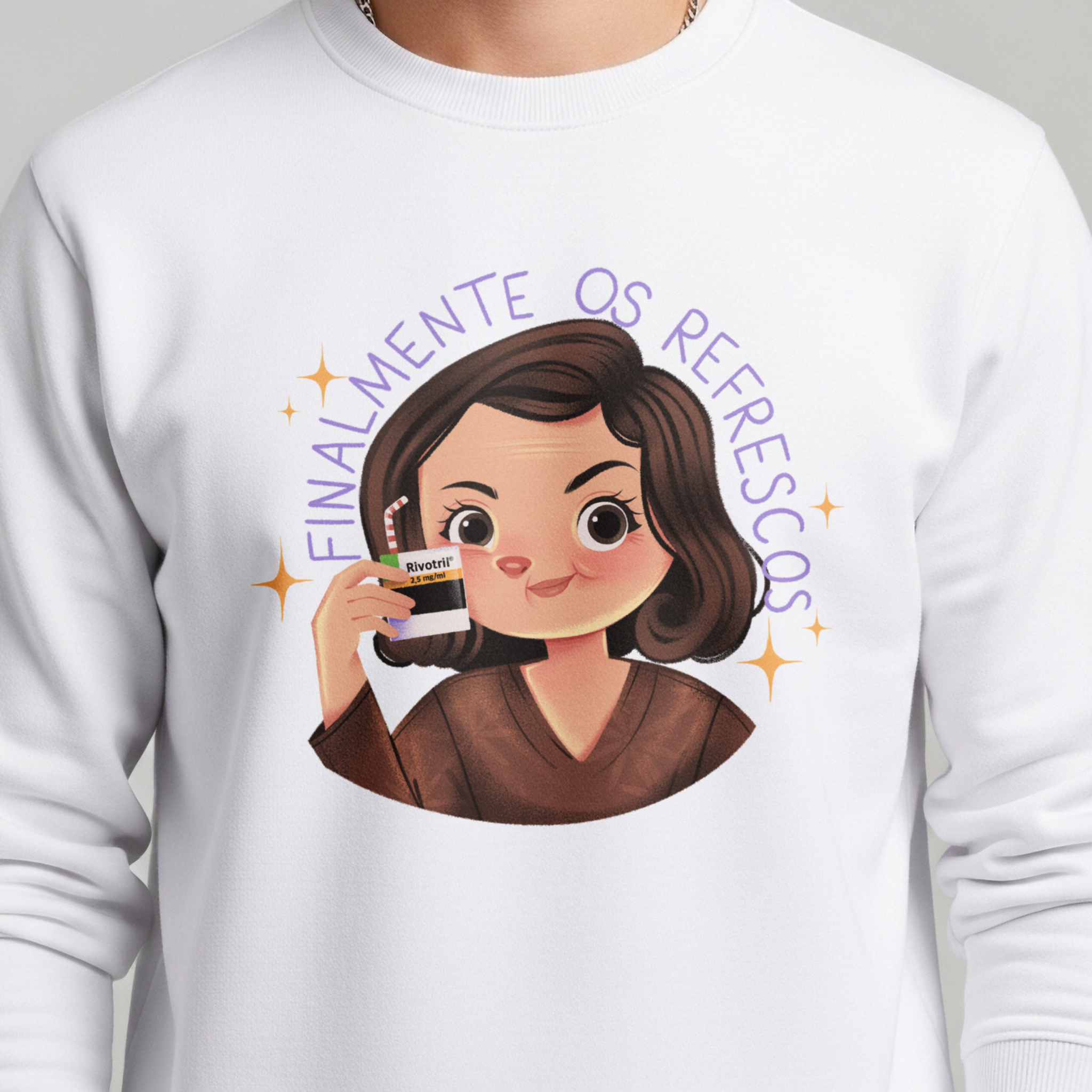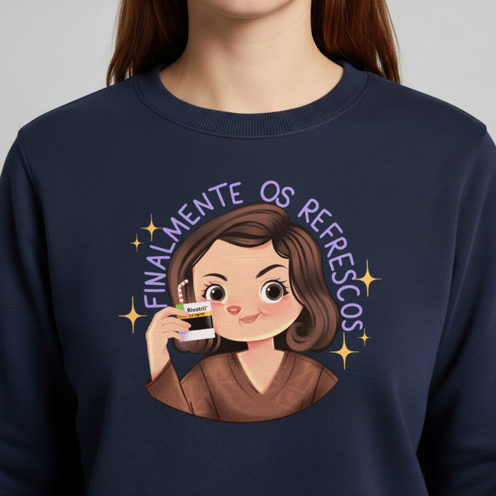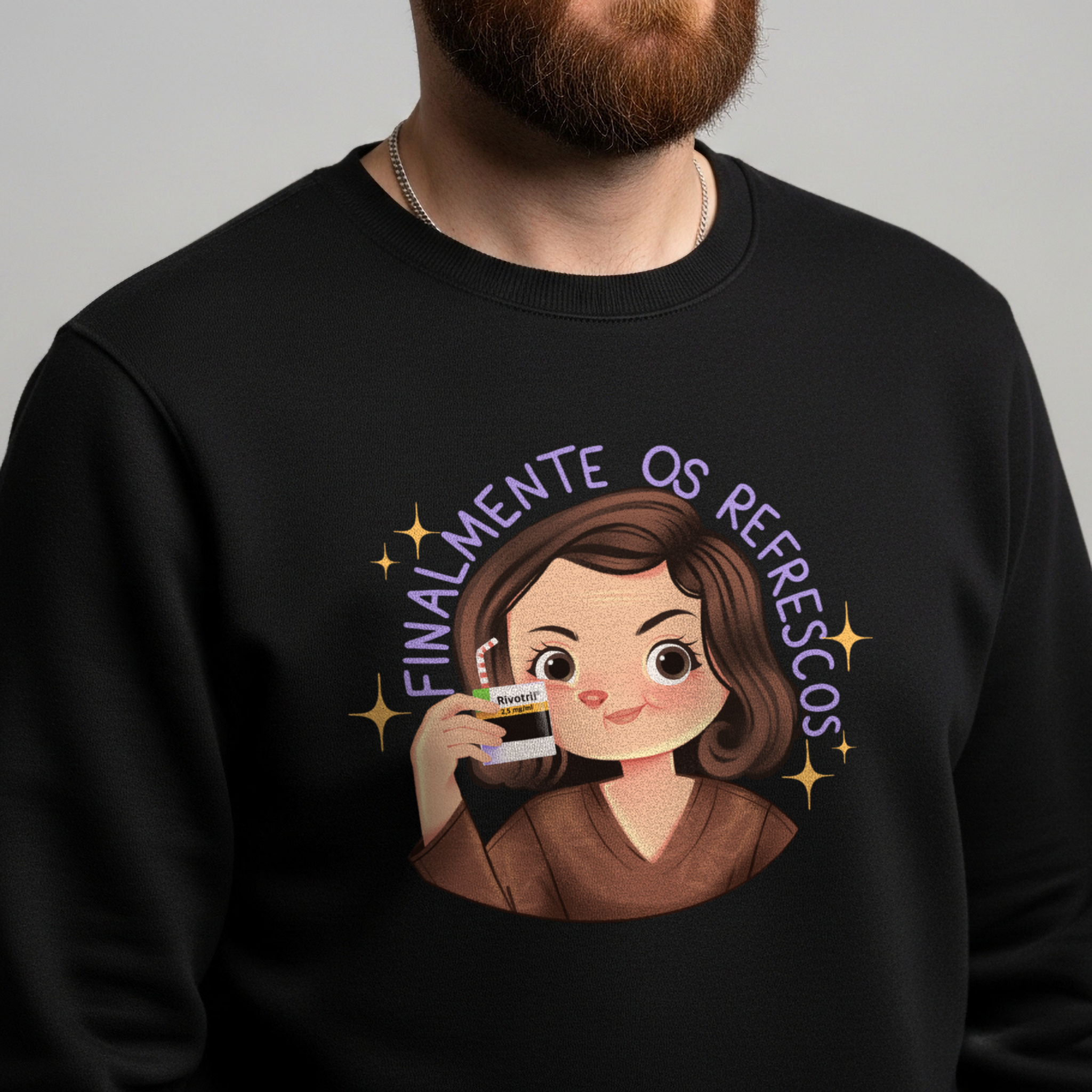 Se a vida adulta fosse fácil, não precisaríamos de refrescos. O moletom Finalmente os Refrescos… da Vida Adulta brinca com o icônico meme de Alma Gêmea, onde Débora (Ana Lúcia Torre) celebra o momento com um suquinho salvador. Só que nesta versão, o refresco vem em dose tarja preta — bem ao gosto de quem enfrenta boletos, prazos e reuniões que poderiam ter sido um e-mail. Ideal para fãs de novelas, cultura pop e humor ácido, esta peça é um lembrete estiloso: viva com drama, mas nunca sem seus "refrescos".