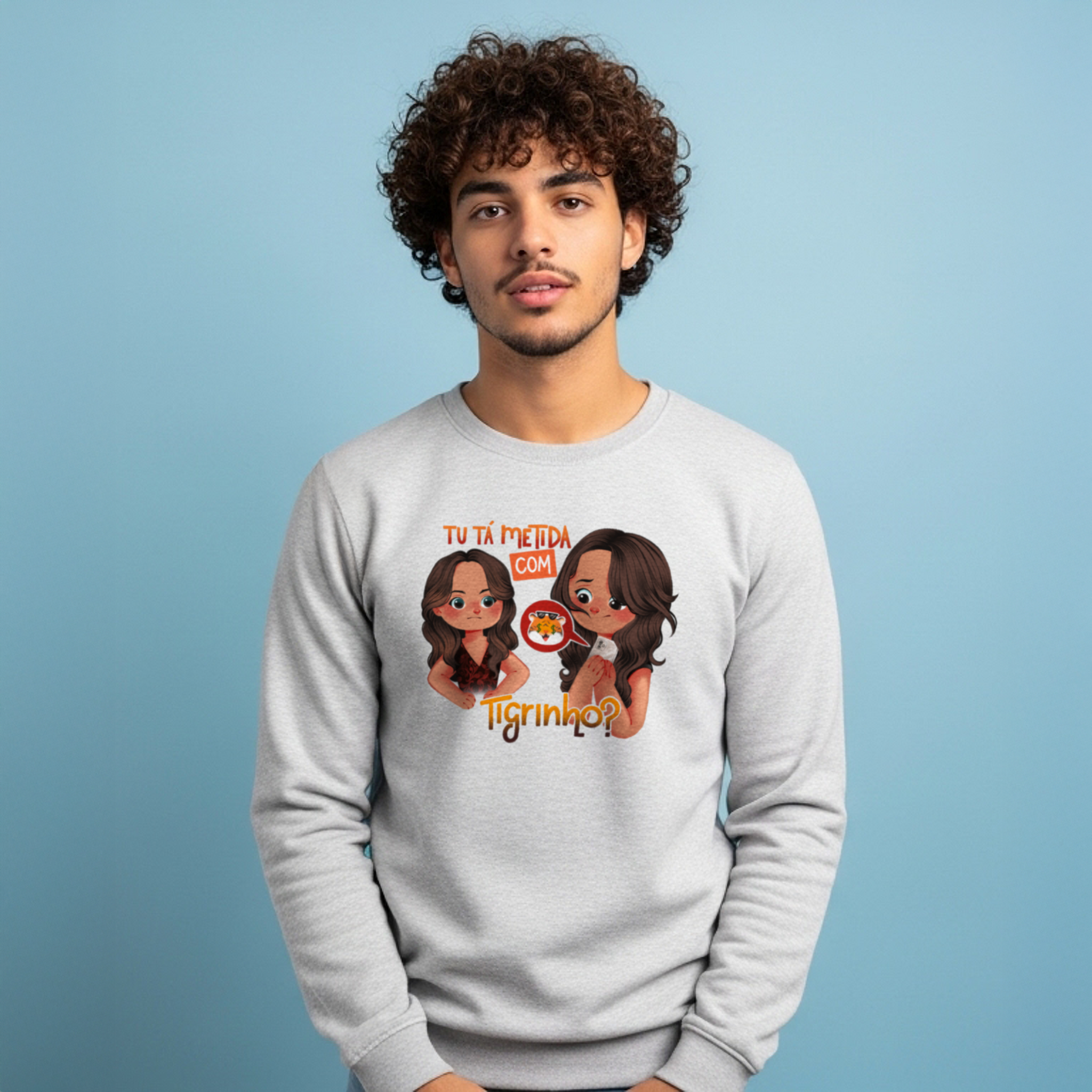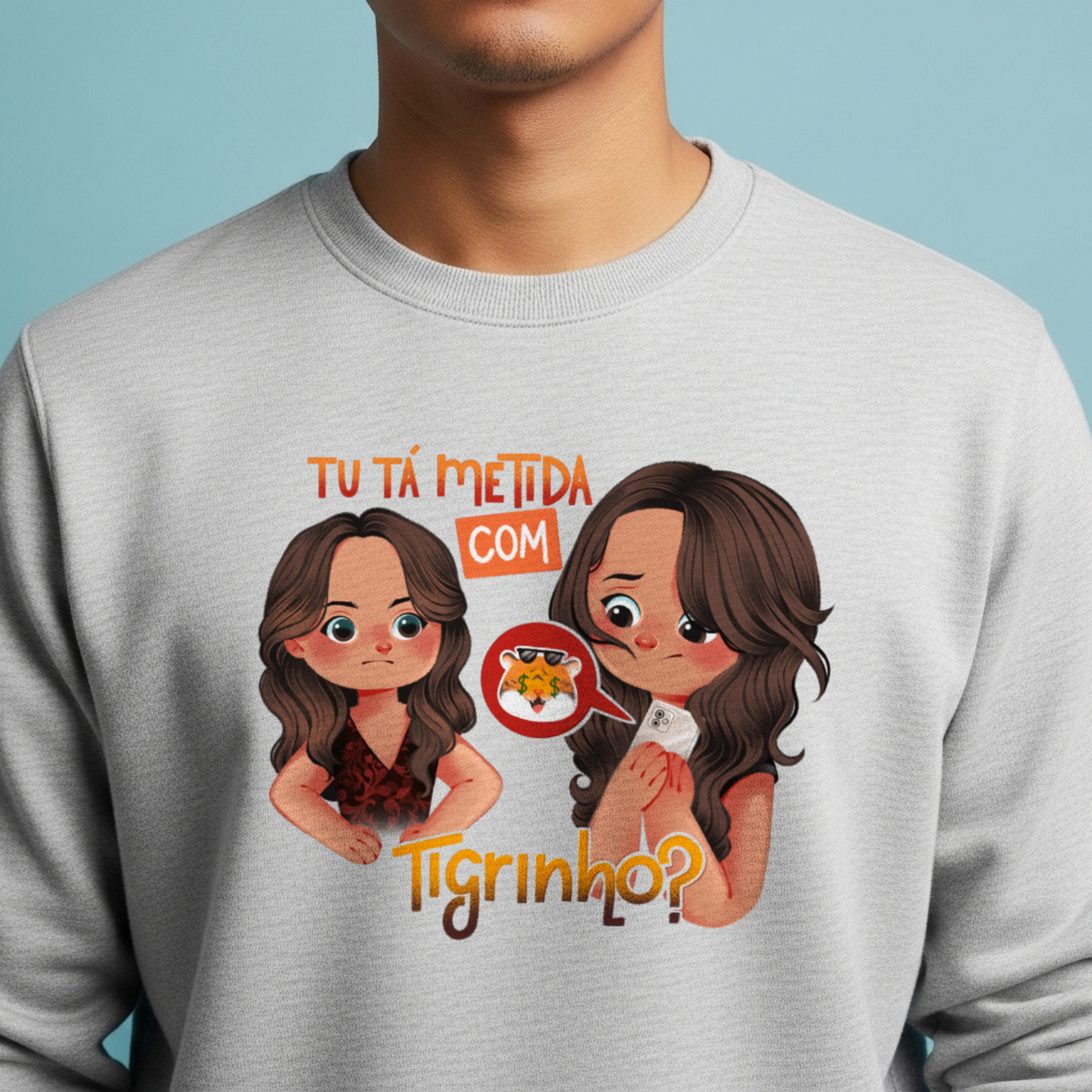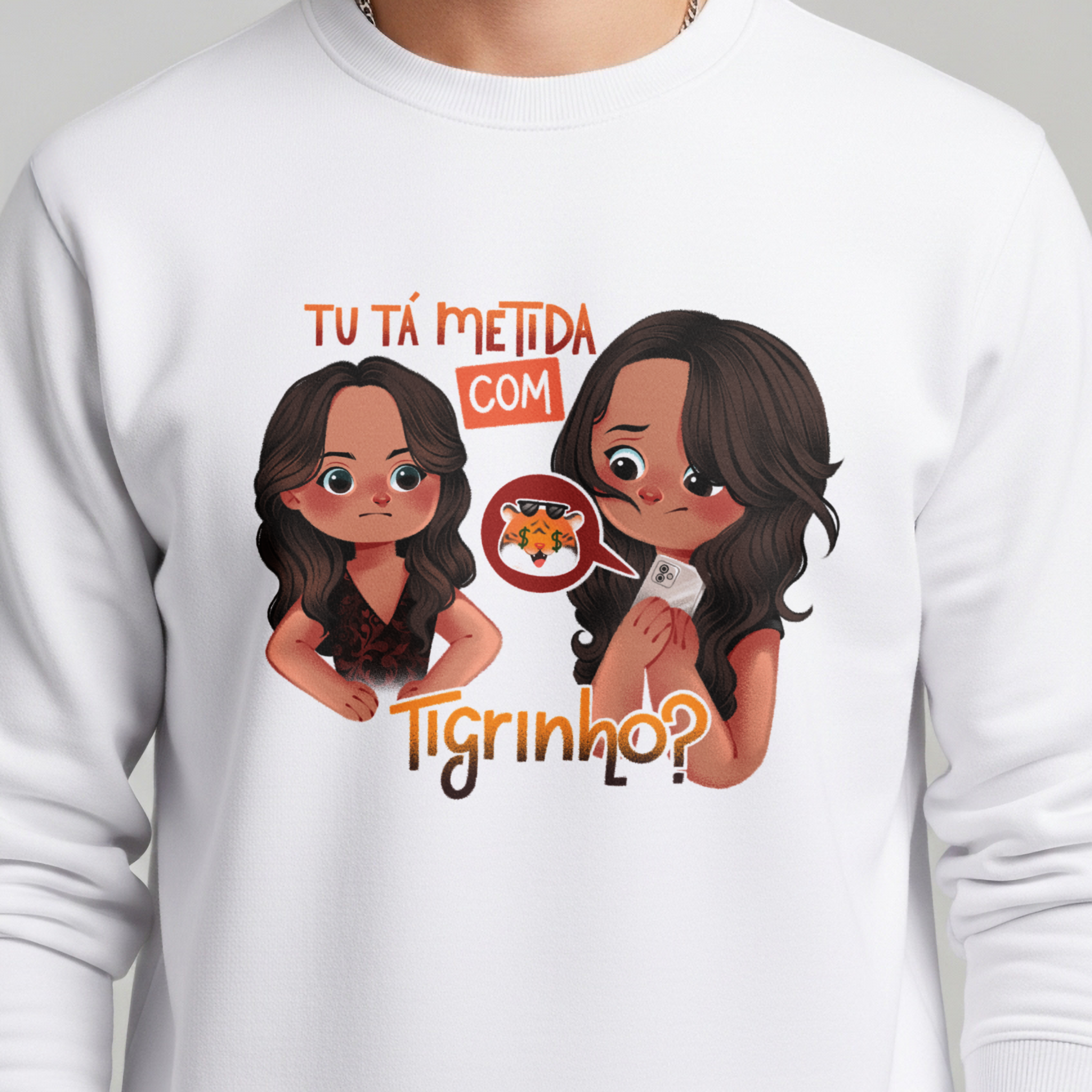 O moletom Tu Tá Metida com Tigrinho? traz uma releitura bem-humorada de uma das cenas mais marcantes de Salve Jorge. Lucimar surge com aquele olhar que dispensa palavras, enquanto Morena esconde o celular, sem saber onde enfiar a cara. A frase icônica agora ganha um novo contexto, refletindo um hábito moderno que muita gente evita comentar. Um toque de crítica disfarçada de meme, perfeito pra quem ama novela, memes e verdades ditas com sutileza.