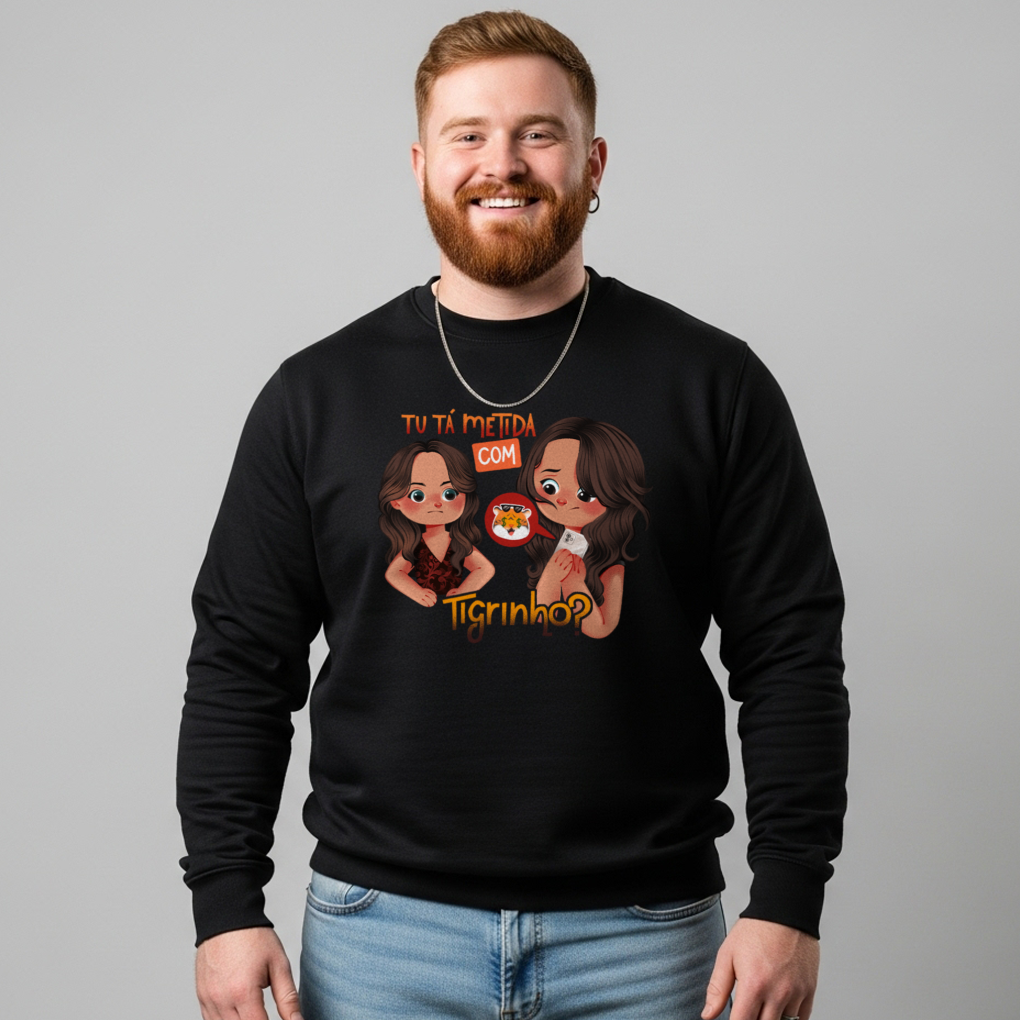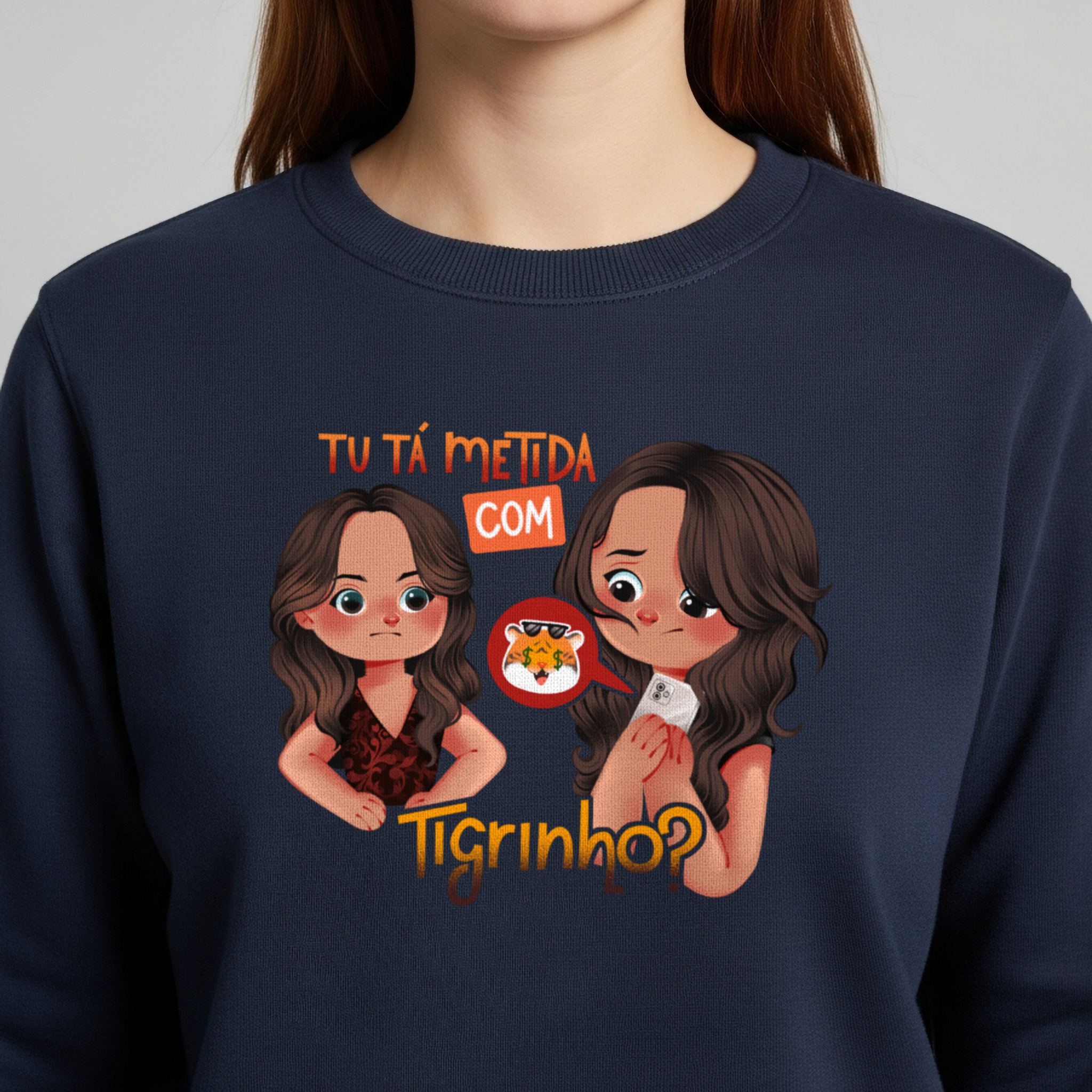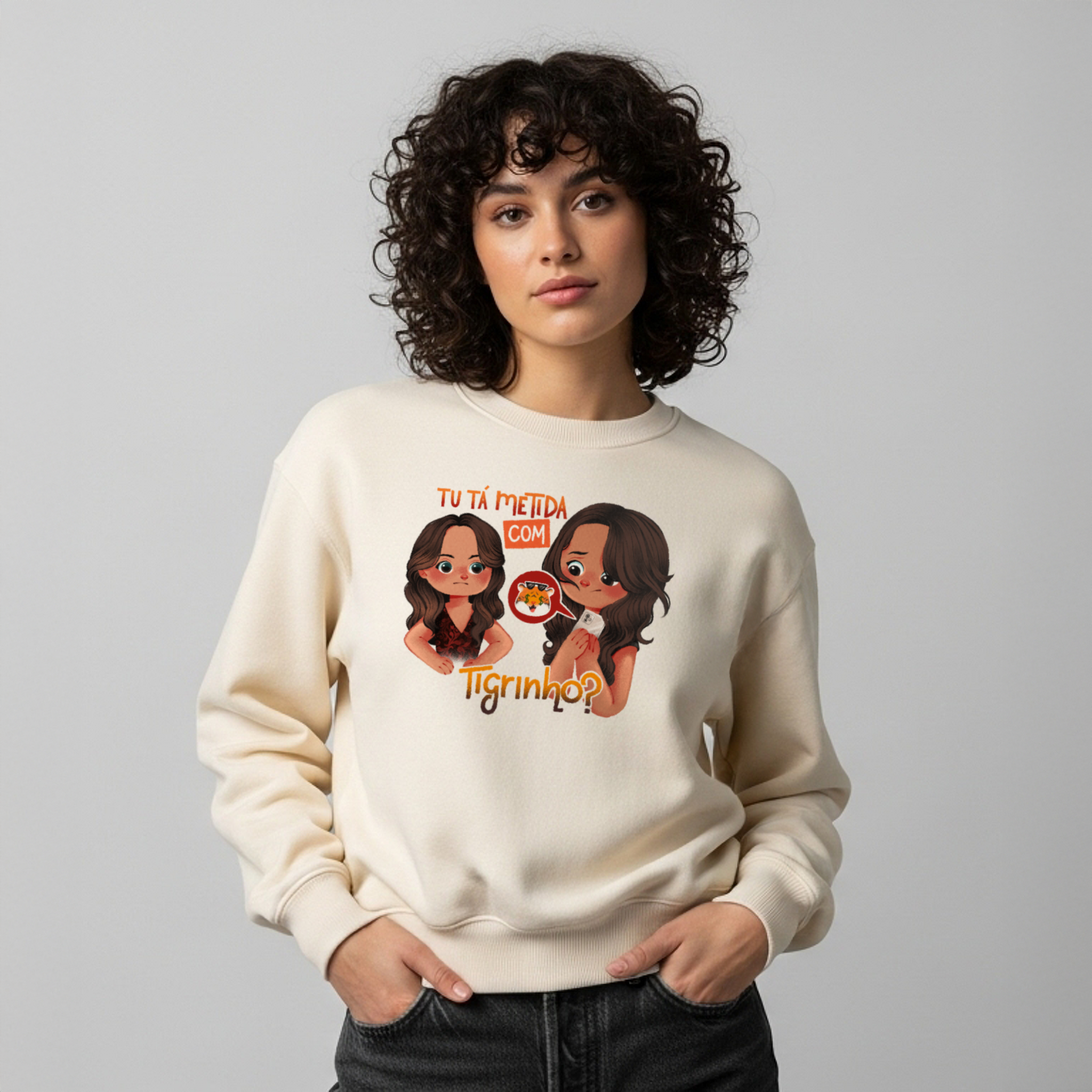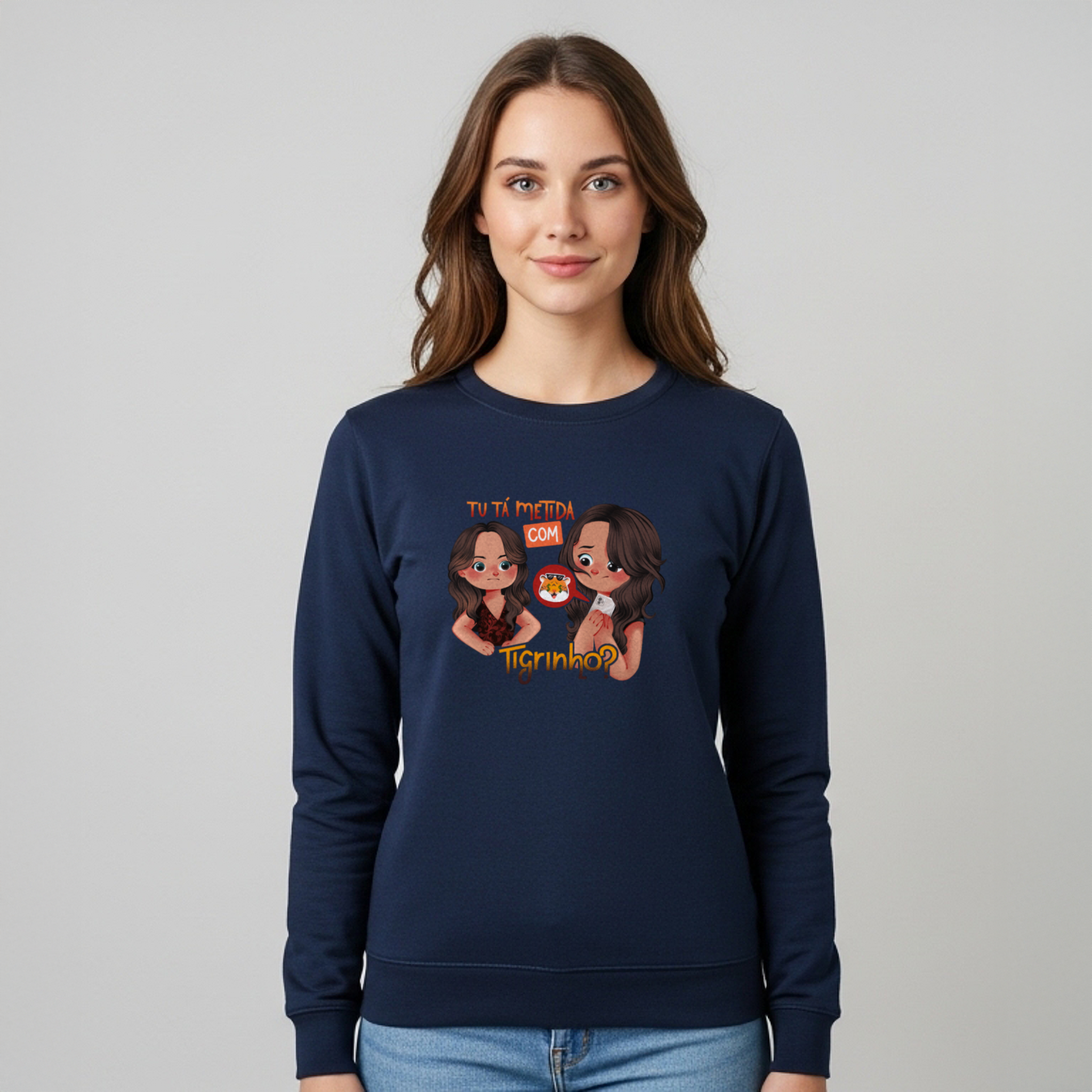 O moletom Tu Tá Metida com Tigrinho? traz uma releitura bem-humorada de uma das cenas mais marcantes de Salve Jorge. Lucimar surge com aquele olhar que dispensa palavras, enquanto Morena esconde o celular, sem saber onde enfiar a cara. A frase icônica agora ganha um novo contexto, refletindo um hábito moderno que muita gente evita comentar. Um toque de crítica disfarçada de meme, perfeito pra quem ama novela, memes e verdades ditas com sutileza.